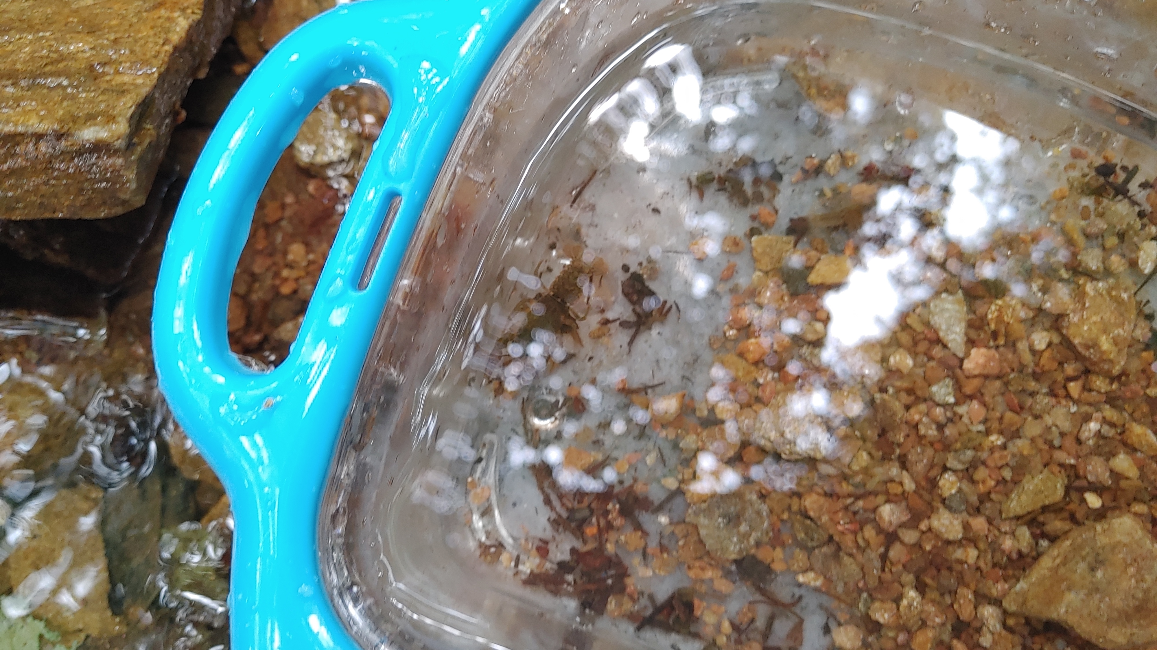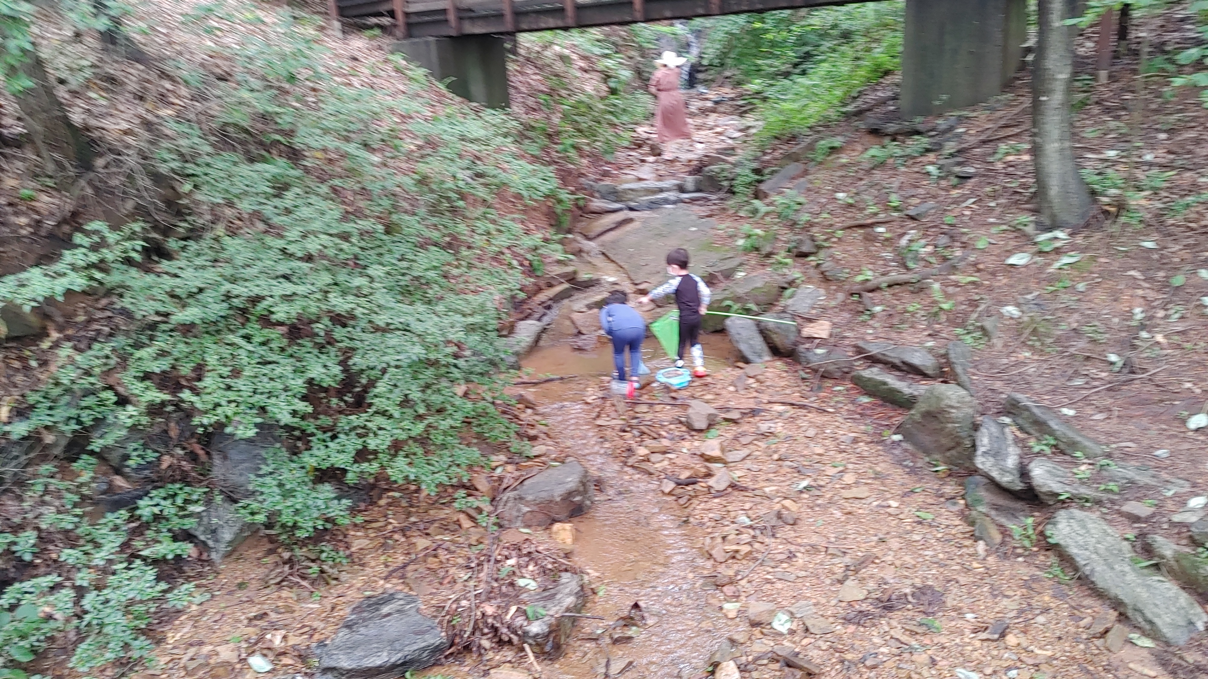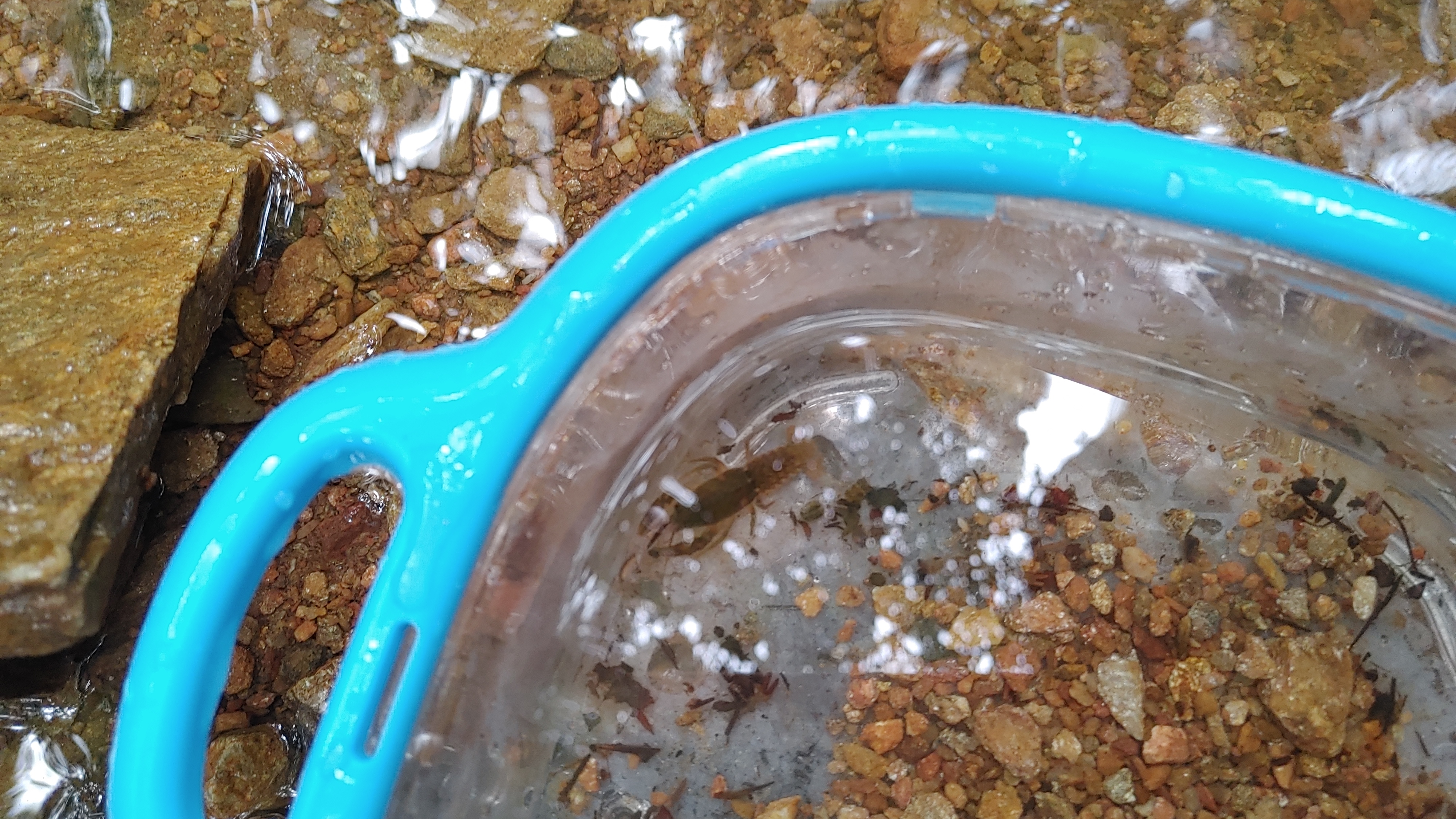 다리 밑으로 내려가서 잠자리채 같은 것으로 개울가 바닥을 긁어서 채를 보면 흙과 함께 작은 가재들을 볼 수 있습니다.