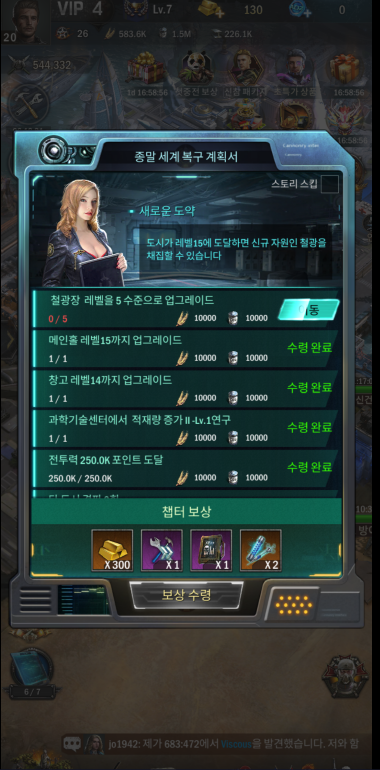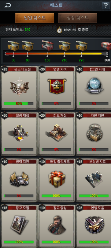 화면 하단에 퀘스트 미션 미션들을 달성하면 성공 포인트 합계에 따라 단계별로 자원 등을 줍니다. 여기서 이런 자원 등을 얻기 위해서 상단에 박스를 클릭해야 자원 등을 주니 꼭 박스를 클릭하시기 바랍니다.