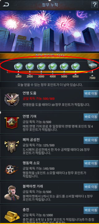 허브센터> 정무 누적을 클릭하면 여러 미션 항목이 있는데 미션 항목을 수행할 때마다 일정 수준 포인트를 달성하면 화면 중간에서 약간 상단 쪽에 포인트별로 동전들이 깜박이게 되는데 해당 코인을 클릭하면 포인트를 얻을 수 있다.