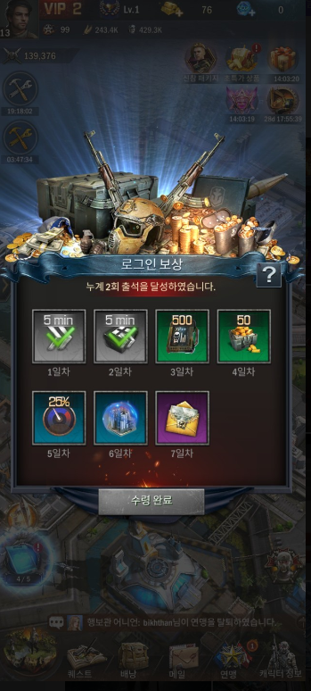 매일 게임에 접속하면 유저들 떠나지 말라고 일정한 수준의 자원을 무료로 제공합니다.