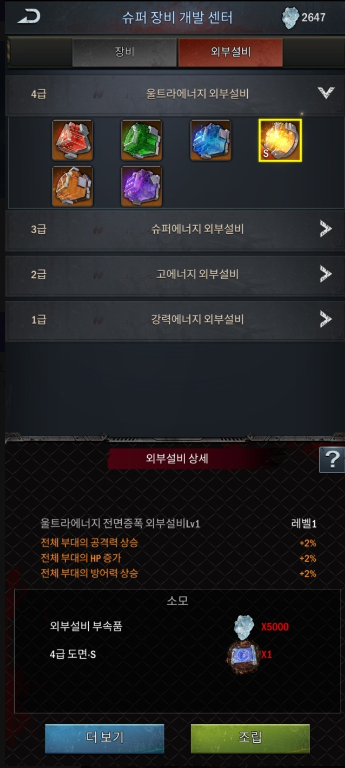 외부설비는 A유형(공격력, HP, 방어력, 대미지 증가, 데미지 감소), S유형(전체 부대의 공격력, HP, 방어력)인데 S유형의 외부설비가 더 좋은 것 같습니다.