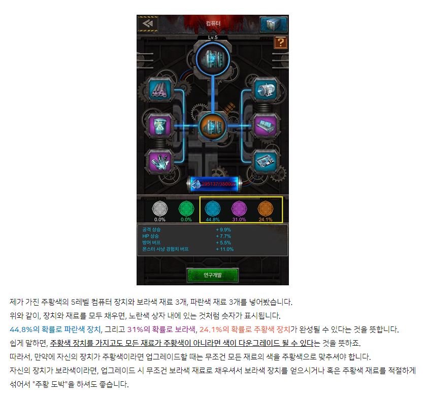 다른 재료와 합성해서도 오렌지색 장비를 얻을 수 있지만 확률이 많이 떨어진다고 합니다.