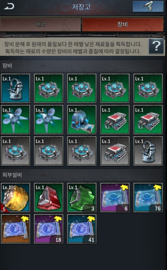 도면 조각 모으는 게 꽤 시간이 오래 걸립니다. 중간중간 낮은 단계(1급, 2급)의 외부설비라도 장비에 장착해서 운영하는 게 좋을 것 같습니다.