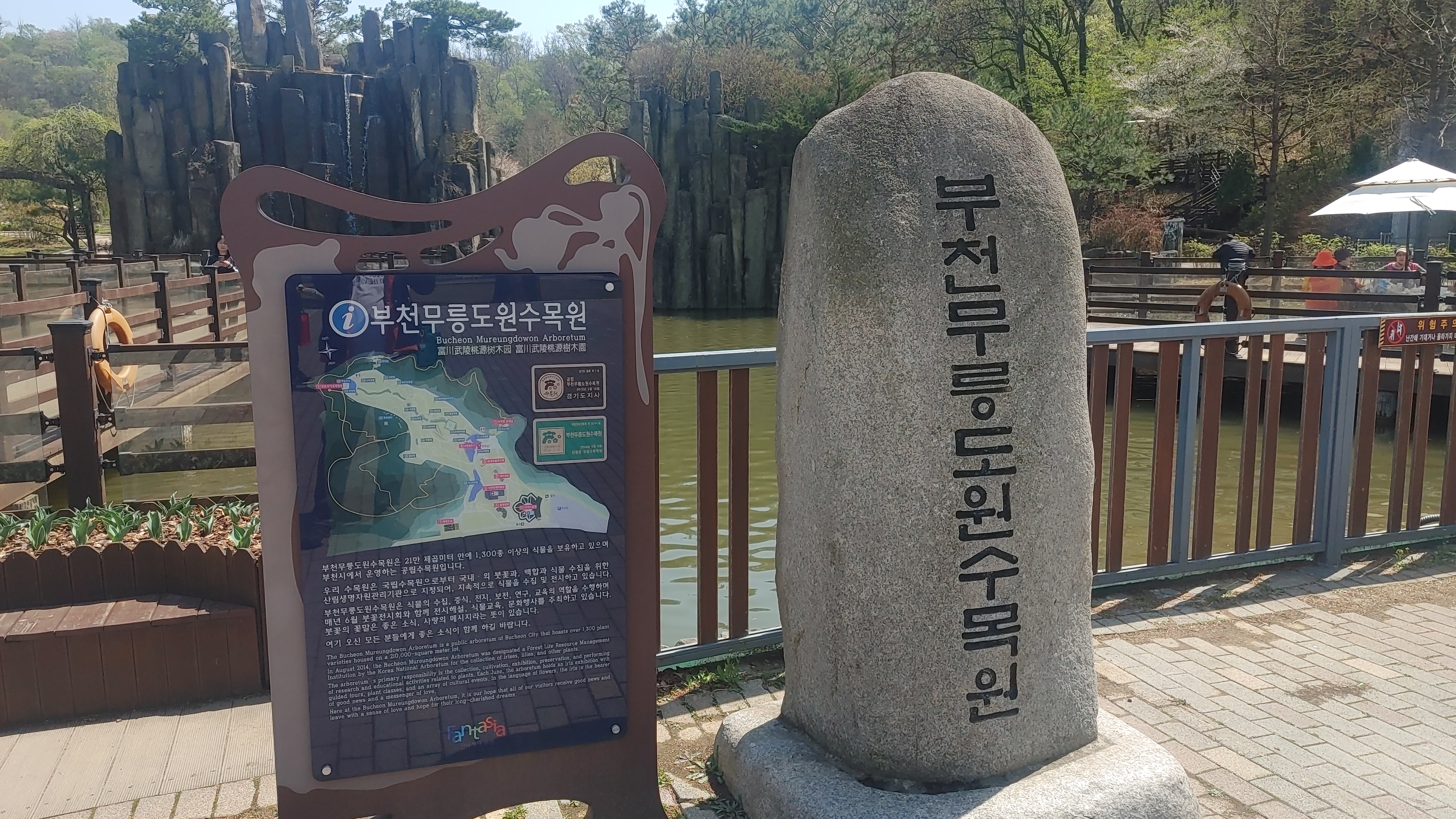 수목원 입구에 있는 오리연못에는 무릉도원수목원의 상징인 절리석의 기암절벽과 폭포가 있으며, 현실의 온갖 고민과 더러움을 연못과 폭포를 통과하며 정화시키고 현실세계로부터 이상세계인 무릉도원으로 들어가면 수목원이 펼쳐집니다.[출처:부천자연생태공원]