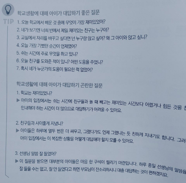 ◇ 학교생활에 이야기를 잘 안 하는 아이가 있을 수 있습니다. 아이가 대답하기 좋은 질문으로 소통하면 좋습니다.