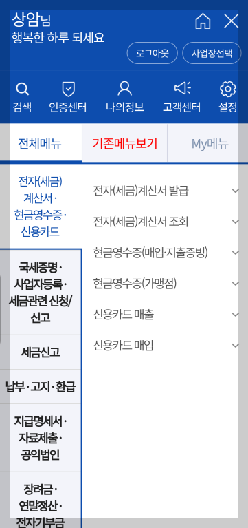 손택스에 접속합니다. 사업장을 선택하고 전체메뉴 중 "전자(세금) 계산서·현금영수증·신용카드"를 선택합니다.