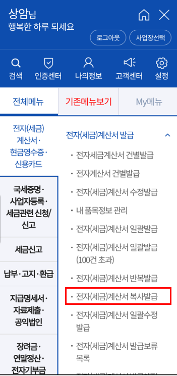 "전자(세금) 계산서 복사발급"을 선택합니다.