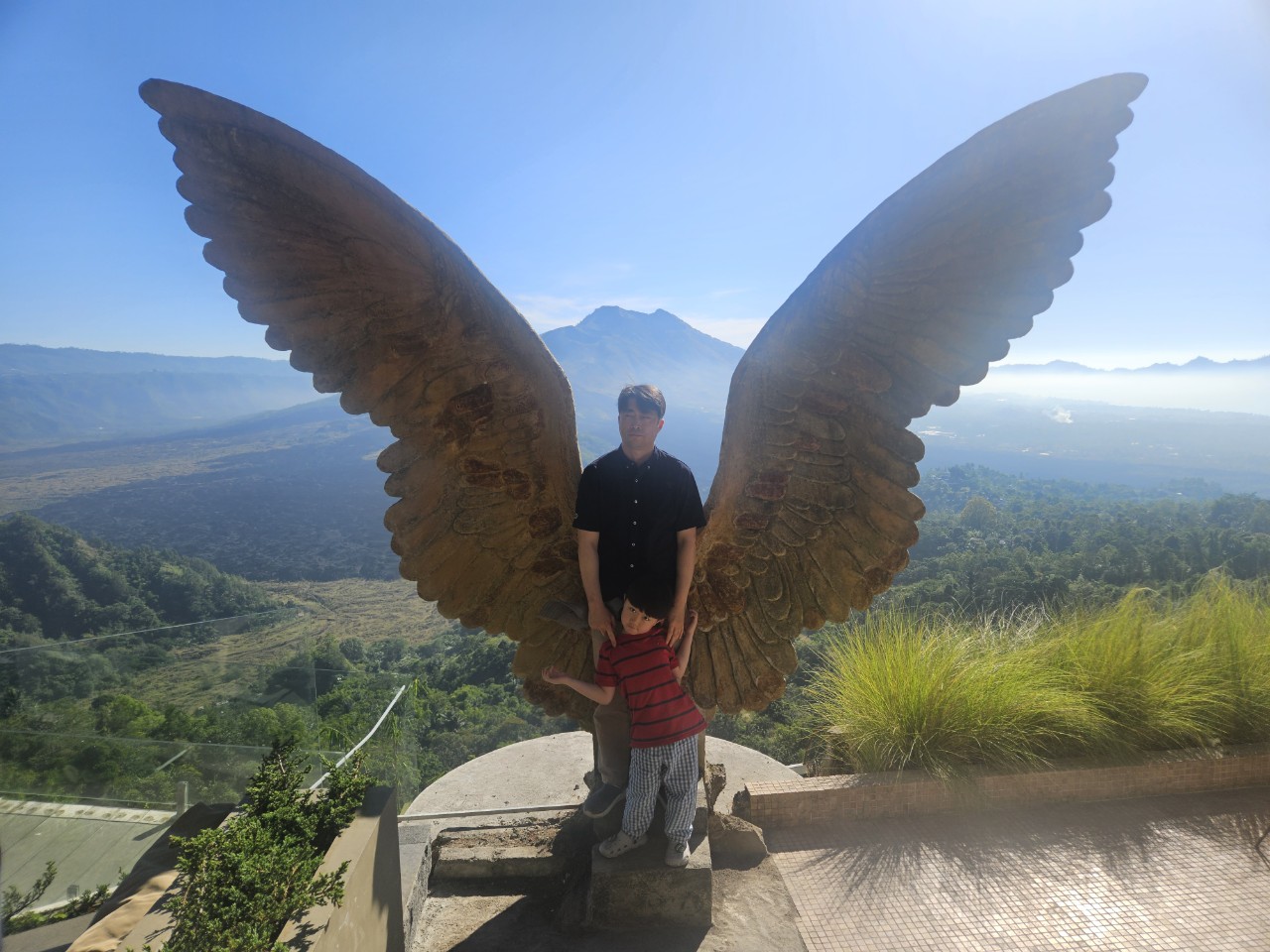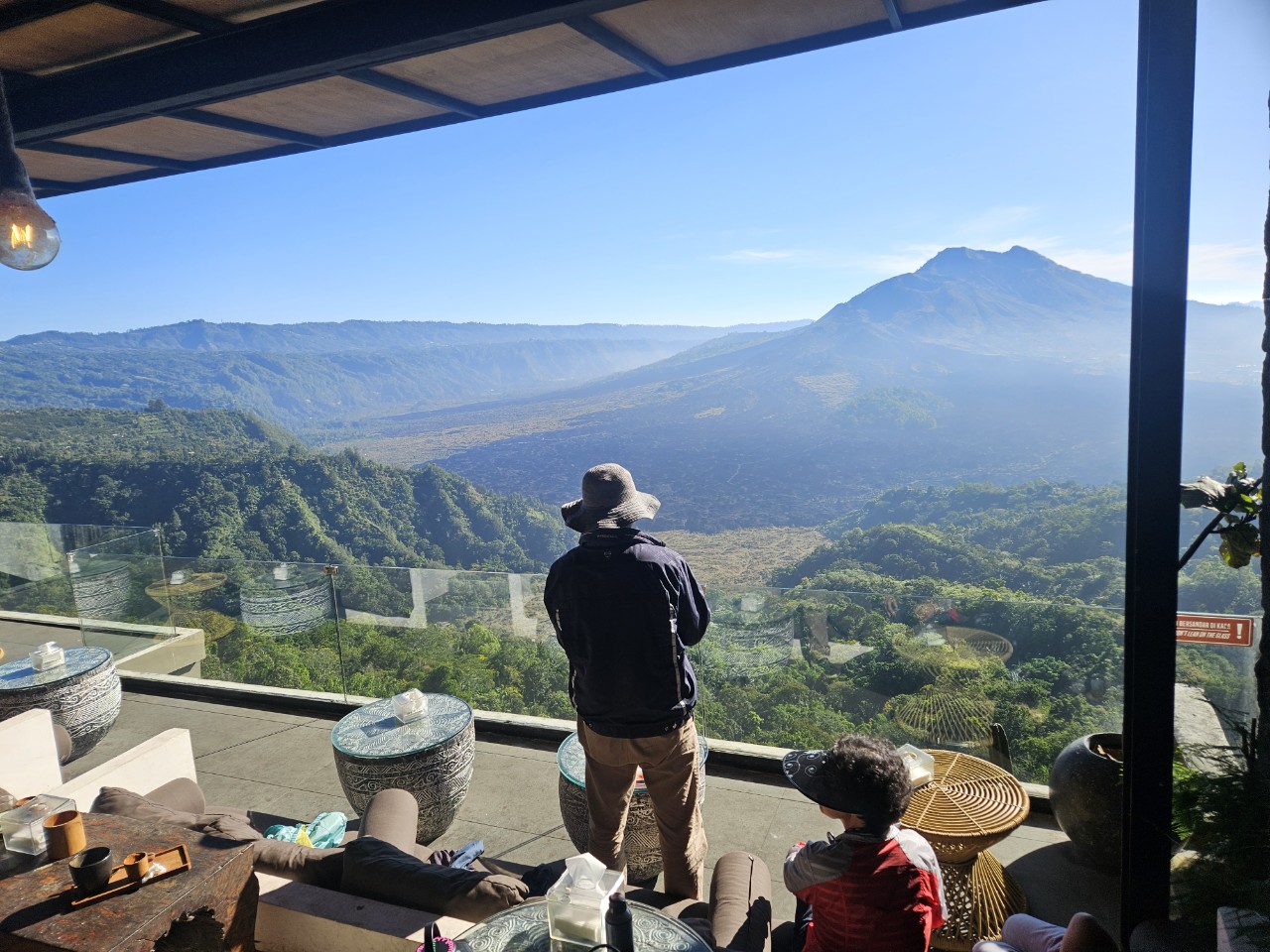 저희들도 4층에 햇빛 잘 드는 곳에 자리를 잡고 맘껏 경치를 즐겼습니다. 다시 봐도 그때의 흥분되고 설렜던 기분이 떠오릅니다. 정면에 바투르산의 우측으로 또 큰 산이 보이는데 저기가 아마 발리에서 제일 큰 산이 "아궁산"으로 알고 있습니다.