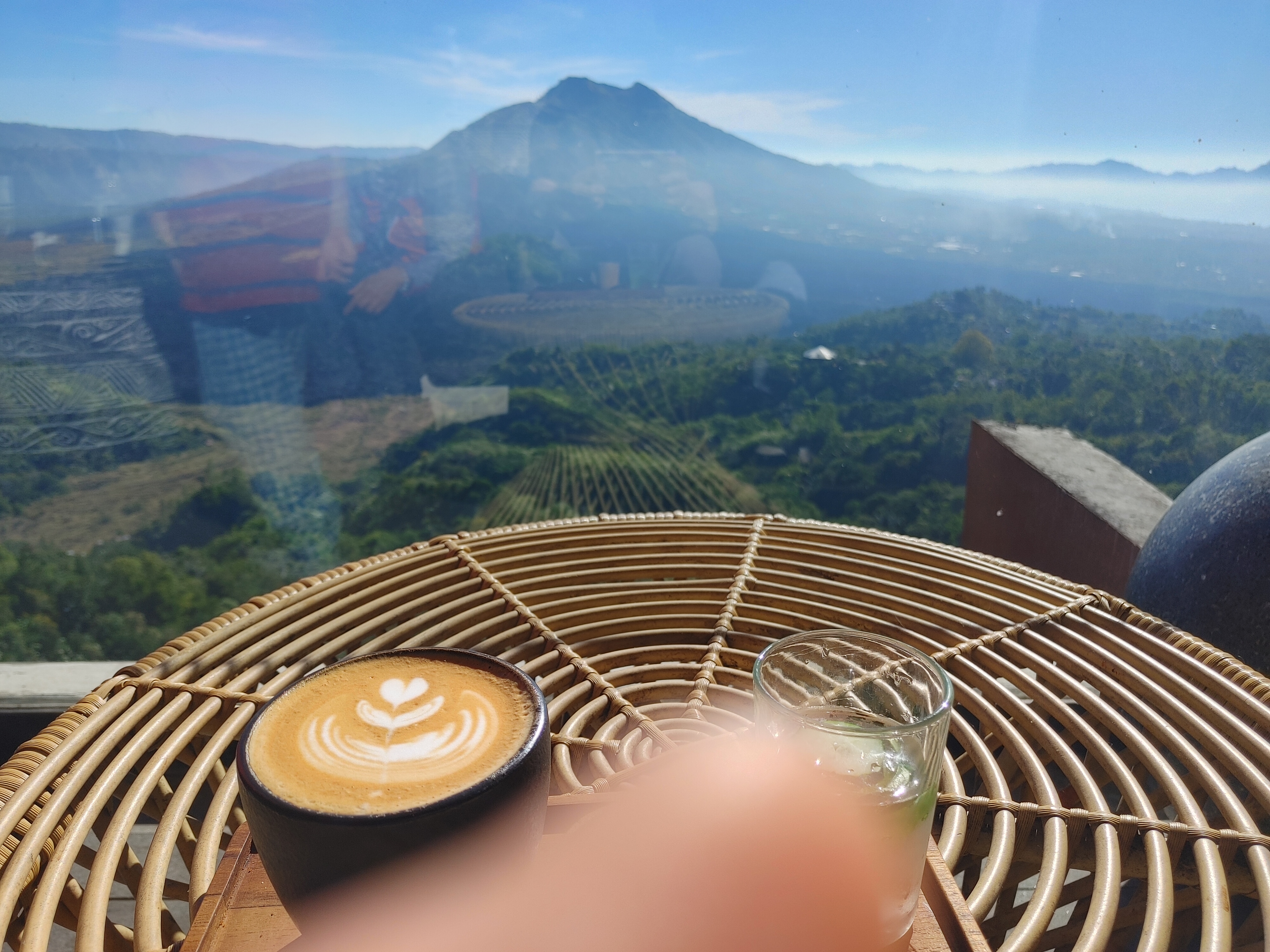 4층 구조로 되어 있고, 들어오는 입구층이 3층입니다. 카페 들어가자마자 시야가 탁 트여있습니다. 다행히 안개가 조금밖에 안 껴서 바투르산이 잘 보이네요! 실제로 보시면 웅장한 자연에 압도감이 들 겁니다.