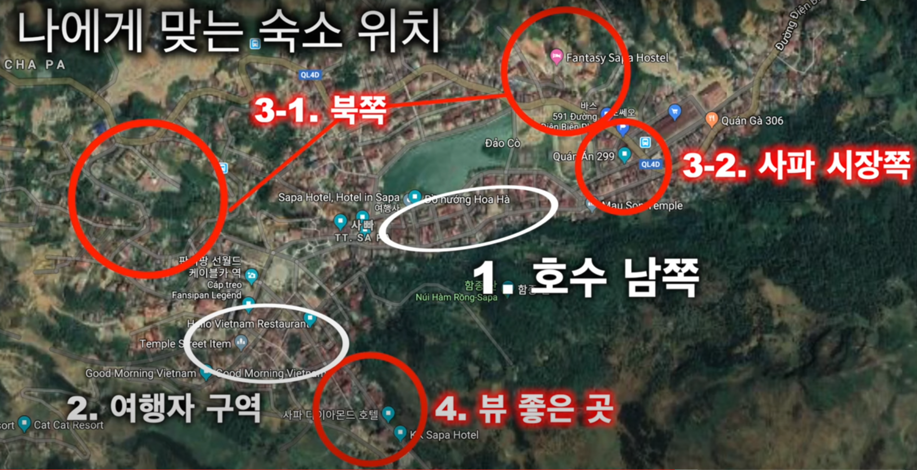 1. 사파센터럴 : 호수 중앙에 두고 형성되어 있음. 동쪽에서 서쪽 끝까지 걸어서 1시간 안으로 이동 가능(좀 작네), 동쪽에는 로컬 사파시장이 있음. 서쪽이 번화가이며 공원, 광장, 성당 등이 있음, 서쪽에 판시판 역이 있음. 쇼핑몰, 호텔, 식당가가 집중되어 있음. 서쪽 아래는 여행자구역이 있음.(서양인들 대상으로 식당, 마사지, 트레킹 용품점이 많음.), 서쪽은 동쪽보다 1.2배 음식값이 비쌈. 밤시간에 볼거리가 많습니다. 주요 이벤트로 매주 토요일마다 사파 성당 주변에서 열리는 러브마켓입니다. 미혼 사파 부족의 선남선녀들이 서로에게 잘 보이기 위해 헌팅 하는 광경이 볼 만합니다.