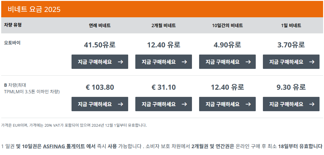 - ASFINAG 공식 웹사이트 또는 앱에서 구매 가능