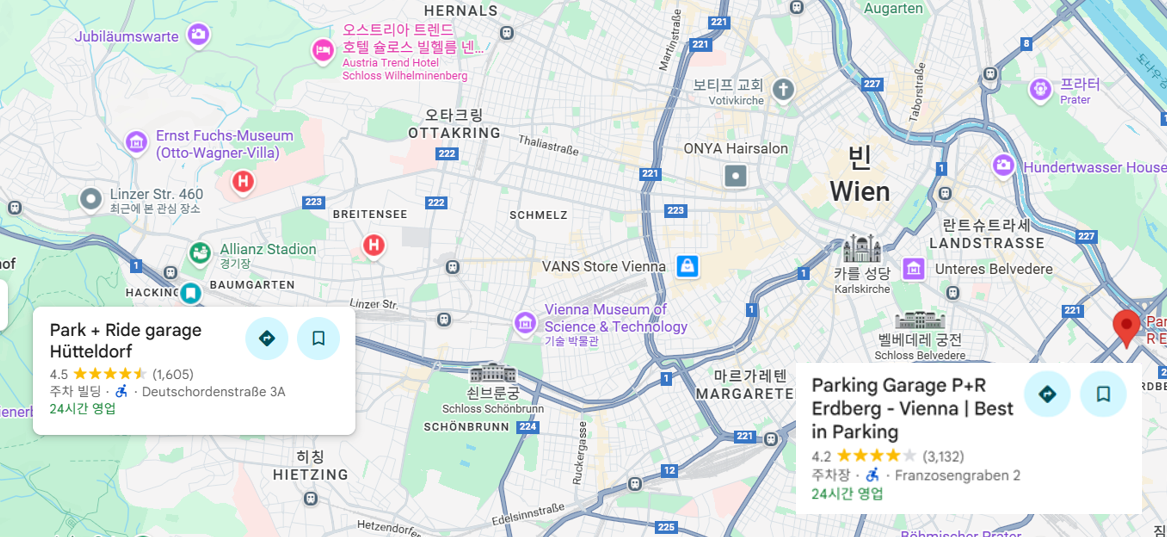 지하철 근처 공유주차장입니다." Park & Ride Erdberg", " Park & Ride Hütteldorf" 입니다.그나마 시내하고 가까운 곳이 Park & Ride Erdberg"이네요.빈 시내 관광 시 추천드리는 사항은 도심 외곽 주차 후 대중교통 이용하는게 효과적입니다.
