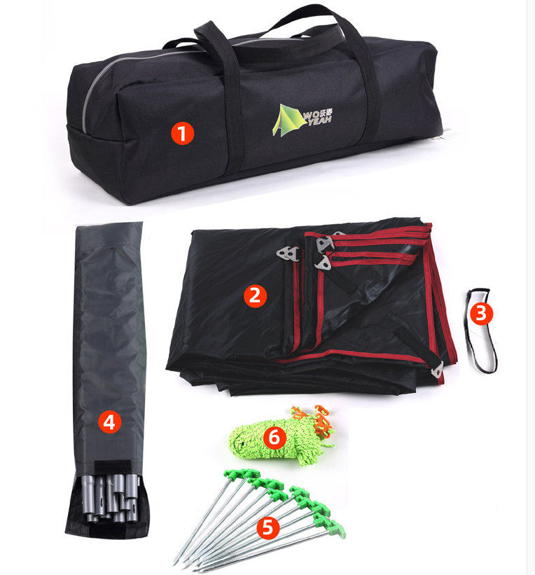 제가 산 중국산 타프입니다. ②이 스킨, ④이 폴대, ⑥이 스트링, ⑤이 팩이라고 보시면 됩니다. 팩은 전문가 의견으로는 40cm 정도 되는 단조 팩을 이용하라고 권장합니다.